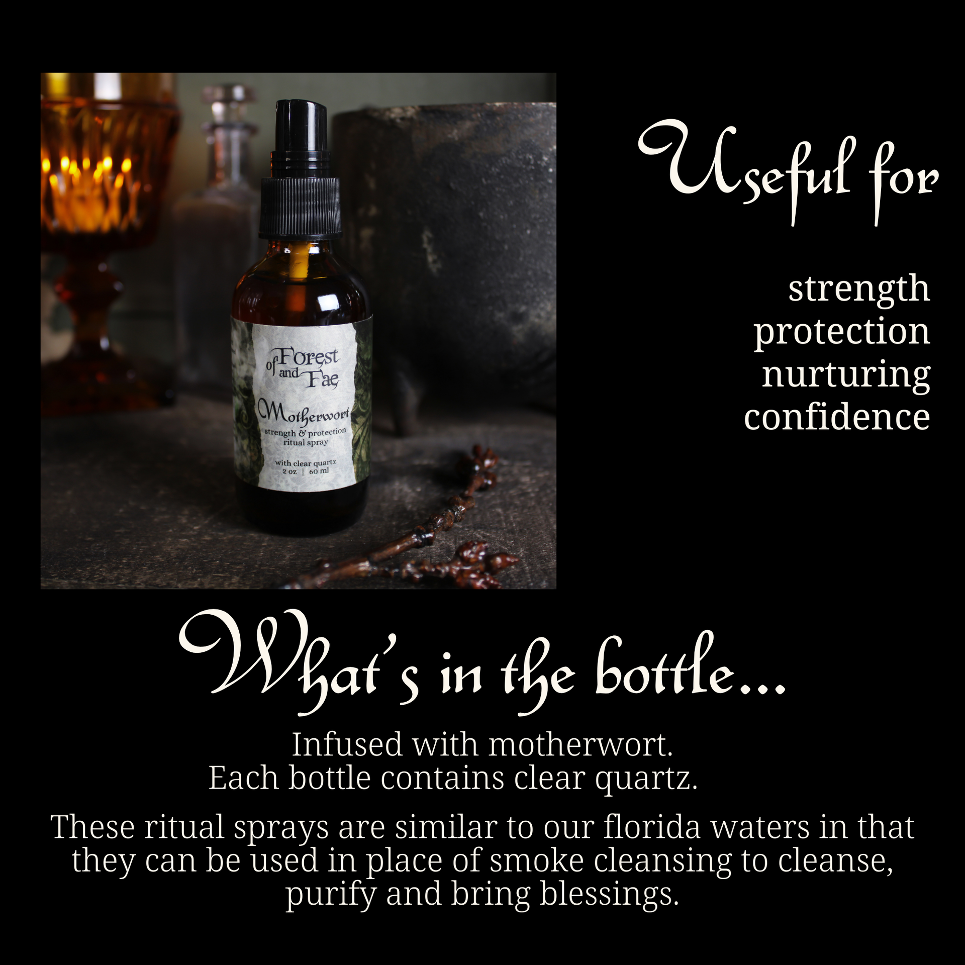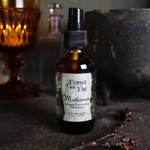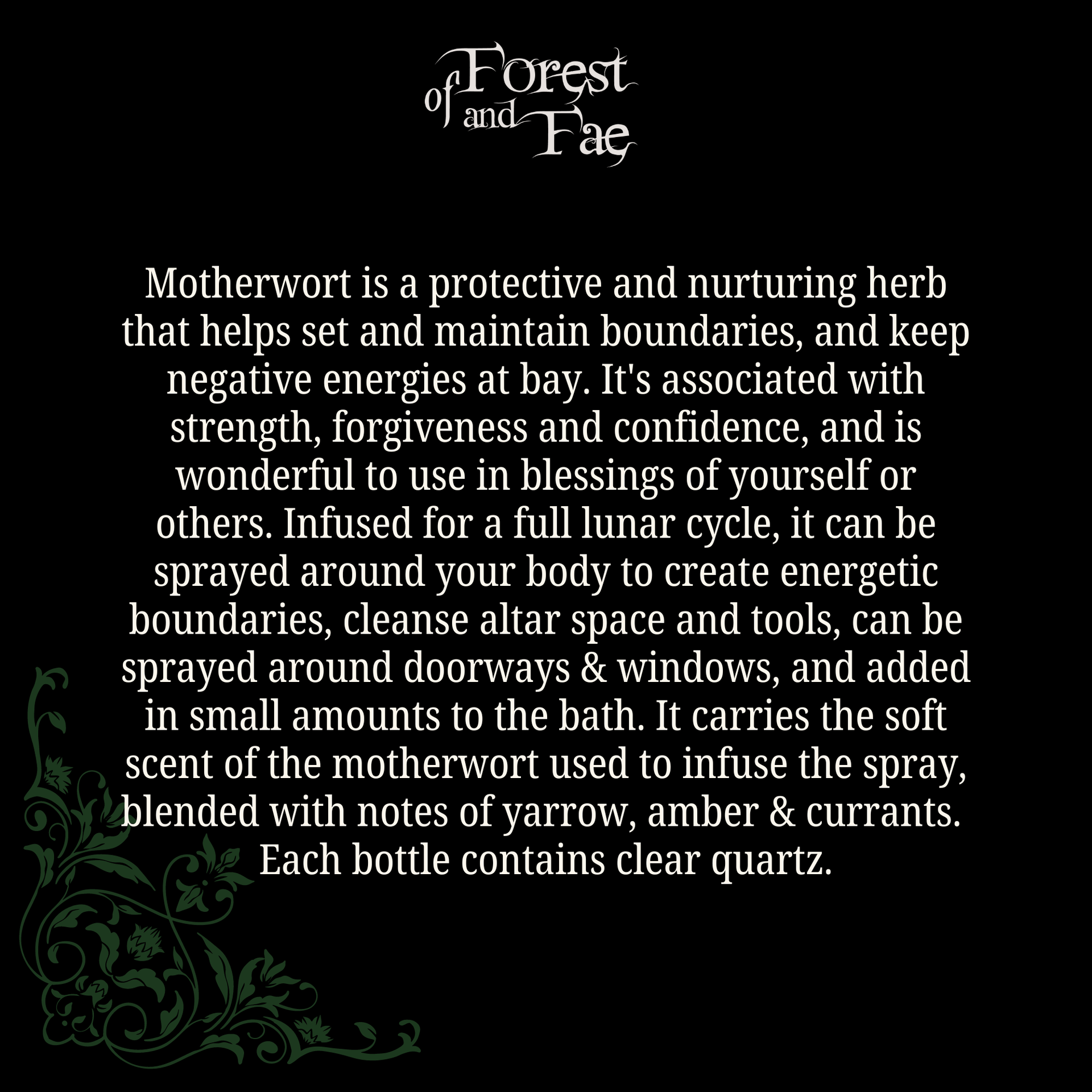 Motherwort is a protective and nurturing herb that helps set and maintain boundaries, and keep negative energies at bay. It's associated with strength, forgiveness and confidence, and is wonderful to use in blessings of yourself or others. Infused for a full lunar cycle, it can be sprayed around your body to create energetic boundaries, cleanse altar space and tools, can be sprayed around doorways & windows, and added in small amounts to the bath. It carries the soft scent of the motherwort used to infuse the spray, blended with notes of yarrow, amber & currants. Each bottle contains clear quartz.